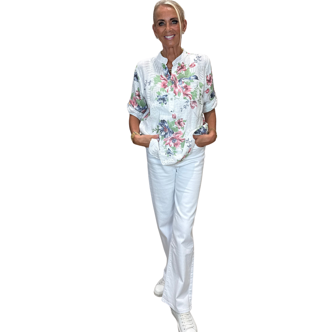 Hvít rósótt hörskyrta